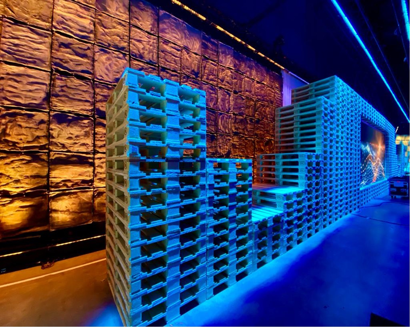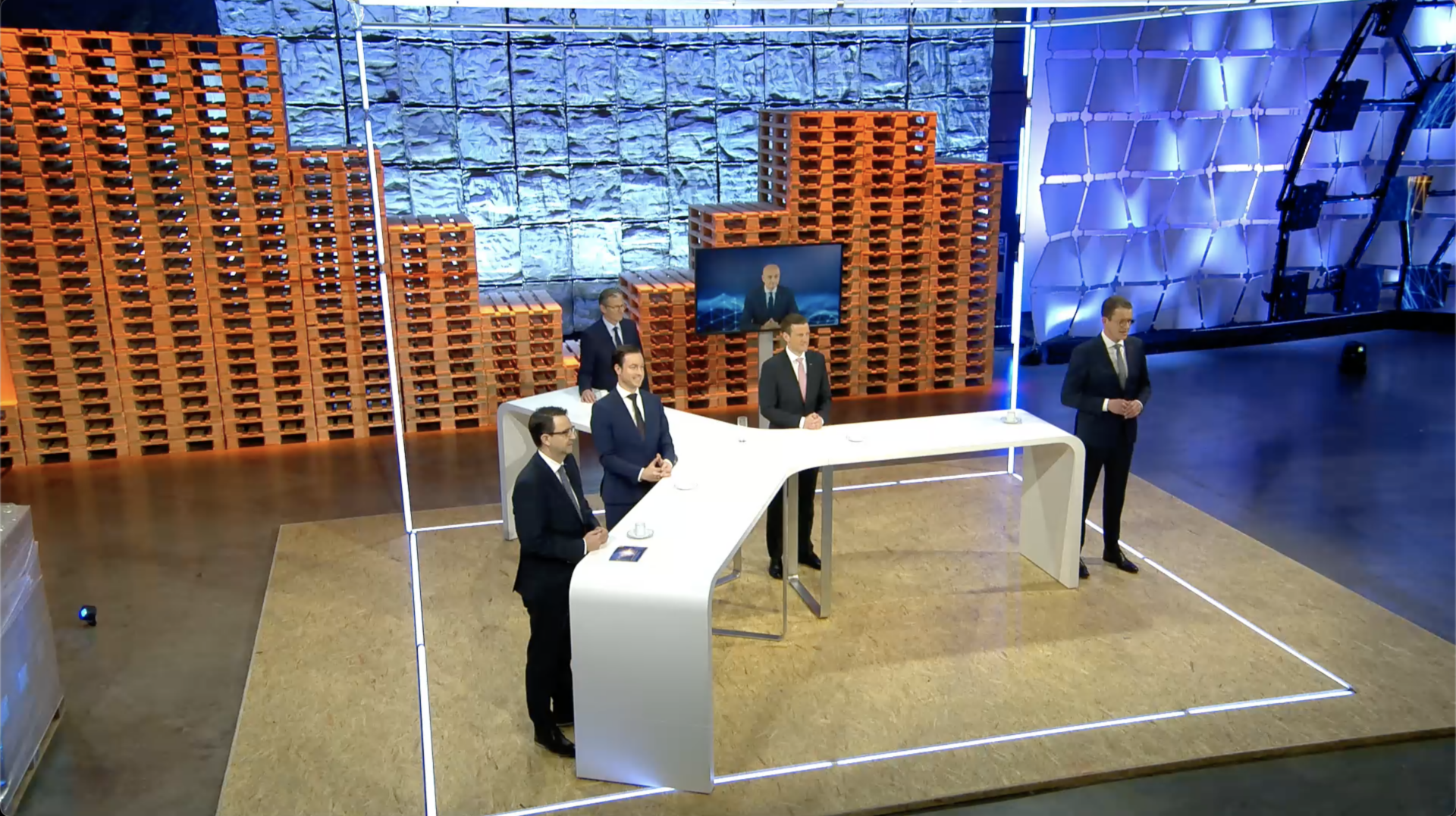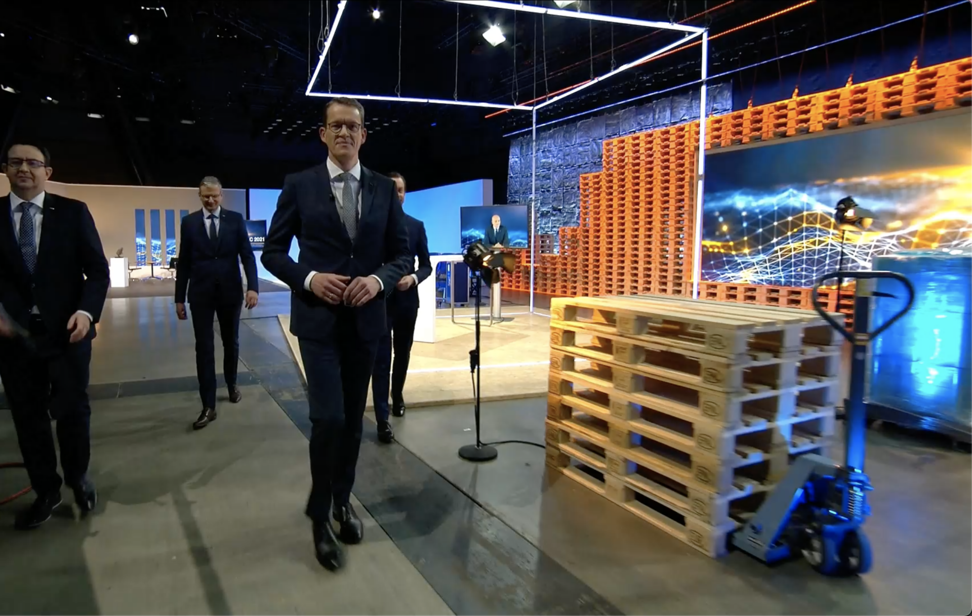 Over three days, a total of 1300 executives worldwide became digitally part of the annual kick-off conference with various settings in a warehouse in the home town of Kempten through an individualized event platform and interaction tools (applause button, break rooms, …). On site the CEOs of the company branches with respective topic settings and connected executives. A subsequent award ceremony with the virtually participating award winners became a small highlight through a staged interactive floor projection.