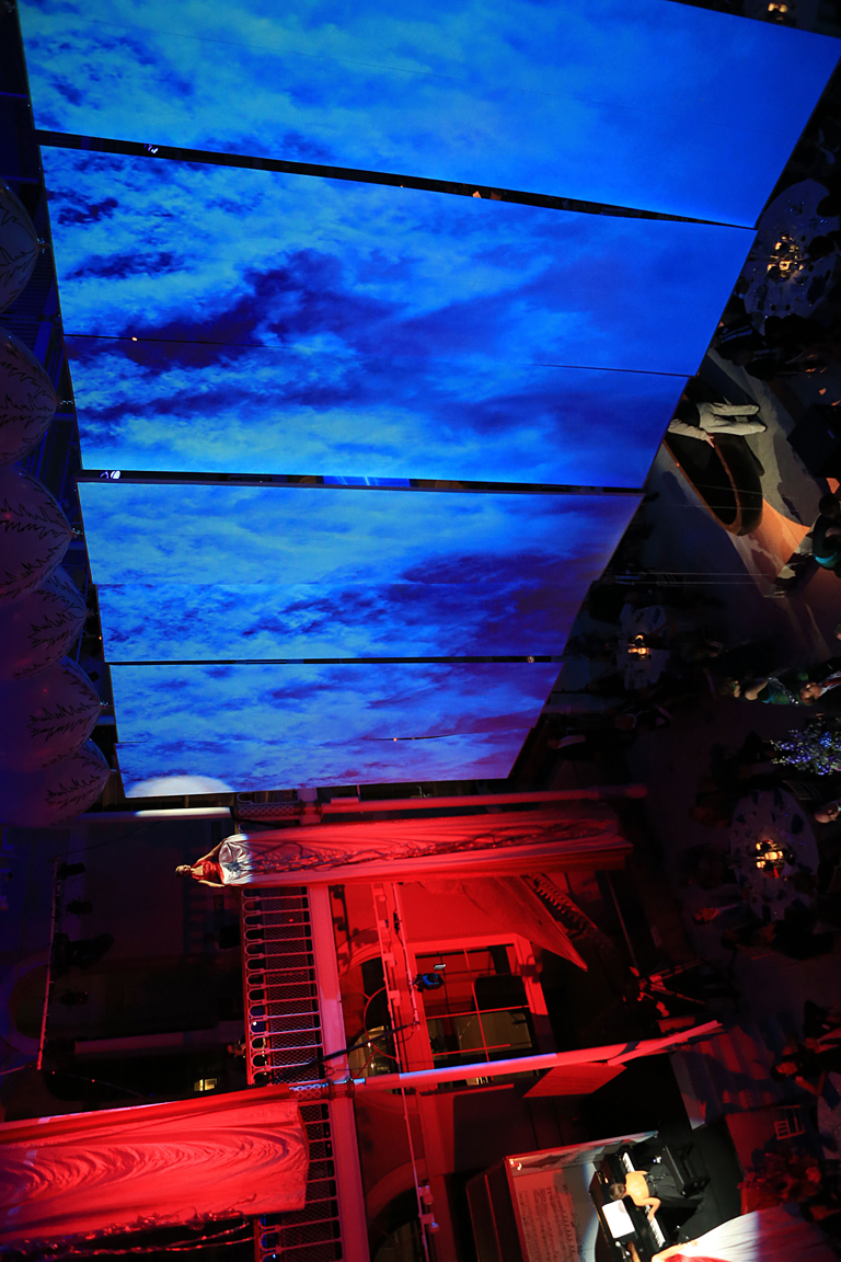 A show across three levels of the space with 20 performers: musicians, dancers, actors. Scottish developments in five acts. Projections onto seven screens carried by helium balloons, freely movable in space.