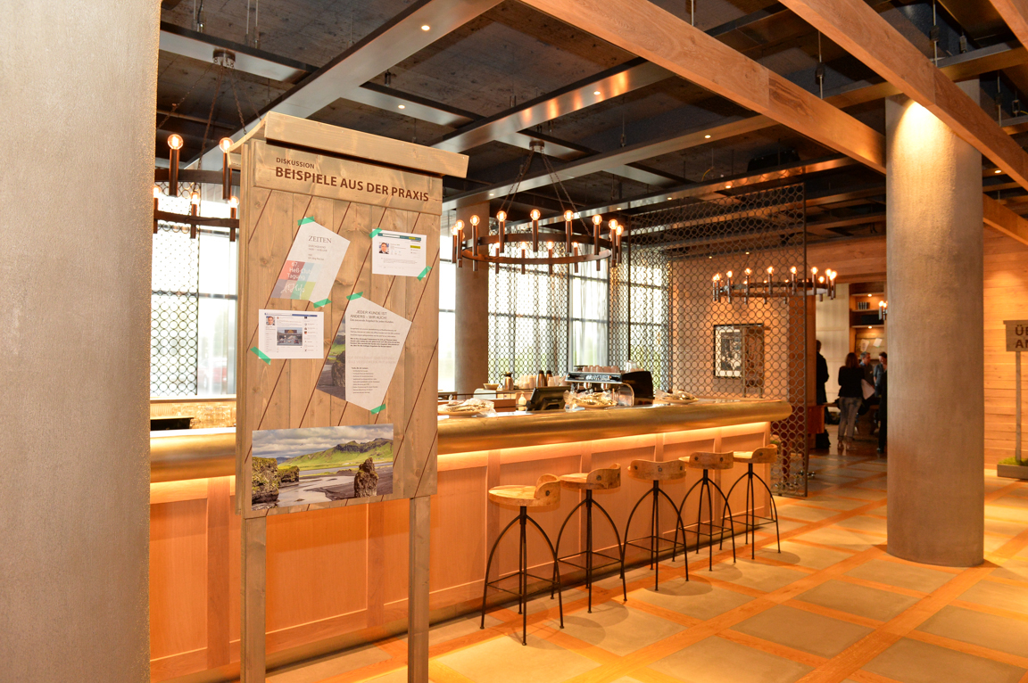 We bring them into a discussion with the companies leading figures in the middle of the landscape – so that the themes use the strength of space, gaining relevance and context for reflection, but also slide back into the context of the company via discussion, exhibit and presentation and therefore develop individual visions. With speakers coaching and best practices the strategic themes become reality and get connected with the newly learned.
