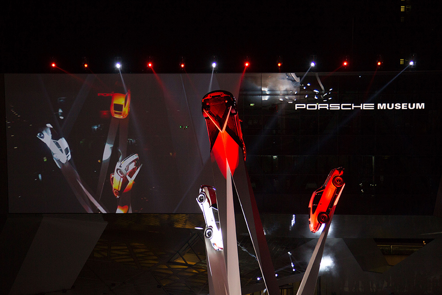 On the plaza in front of the Porsche Museum in Zuffenhausen, is a Porsche Sculpture. Opening it to the Public was a large spectacle, where new Porsches initiated the lighting rushing up the sculpture, unveiling it to Public, VIPs and Press.